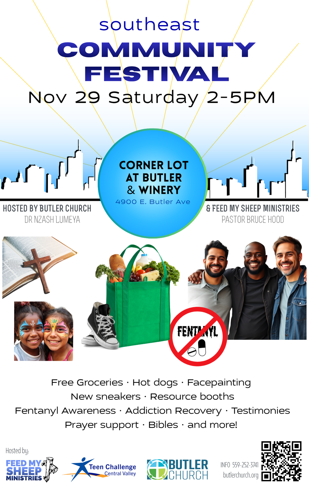 Across the corner from Butler Church on the empty lot. Special thanks to Fresno Pacific University for their partnership in making this location available!