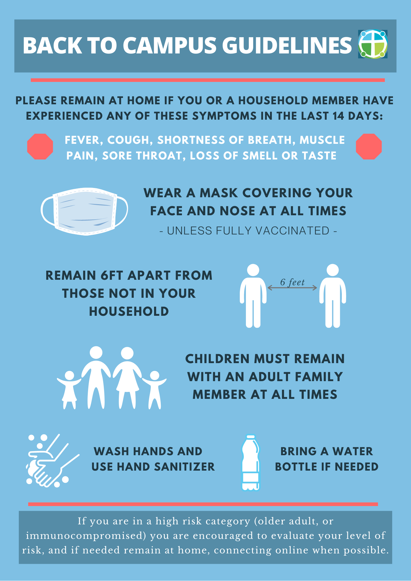 * Children and anyone at risk should continue to wear a facemask indoors. Although those who are fully vaccinated may choose not to wear a facemask, mask wearing continues to be a good option to protect yourself and set others at ease. We are so thankful for your cooperation and willingness to practice these important safety protocols. We will no longer be asking for sign-ins at our gatherings, and have also reduced our sanitizing of hard surfaces. Let’s continue to pray that COVID continues to recede, and with it these safety measures!